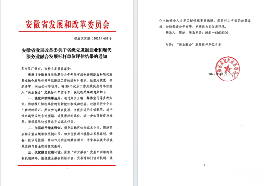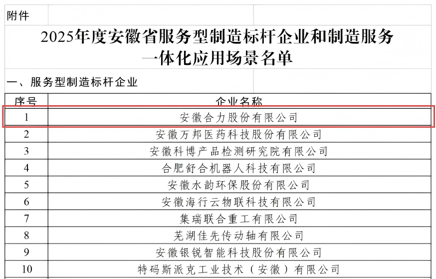 近日,安徽省发改委、安徽省工信厅分别公布《关于省级先进制造业和现代服务业融合发展标杆单位评估结果的通知》《关于公布2025年度服务型制造标杆企业和制造服务一体化应用场景名单的通知》,尊龙凯时成功入选安徽省“两业融合”发展标杆单位和服务型制造标杆企业。此次成功入选“双标杆”企业,标志着公司从传统工业车辆制造商向“制造+服务”综合解决方案提供商转型获得显著成效。